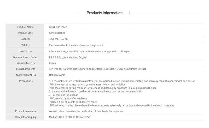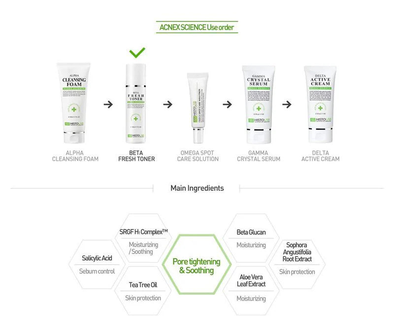 [Ingredients] Water, Alcohol Denat., Aloe Barbadensis Leaf Juice, Betaine, Phenoxyethanol, Panthenol, Sodium Hyaluronate, Beta-Glucan, PEG-60 Hydrogenated Castor Oil, Portulaca Oleracea Extract, Sodium Benzoate, Symphytum Officinale Leaf Extract, Poncirus Trifoliata Fruit Extract, Centella Asiatica Extract, Sophora Angustifolia Root Extract, Psoralea Corylifolia Fruit Extract, Melaleuca Alternifolia (Tea Tree) Leaf Oil, Salicylic Acid, Disodium EDTA, sh-Oligopeptide-1, Arginine, Schima Wallichii Bark Extract, Polysorbate 80, Polysorbate 20, Mentha Piperita (Peppermint) Extract, sh-Polypeptide-4, sh-Polypeptide-16, sh-Polypeptide-1, Sodium Oleth-8 Phosphate, Butylene Glycol, Lecithin, Nicotinoyl Hexapeptide-44.