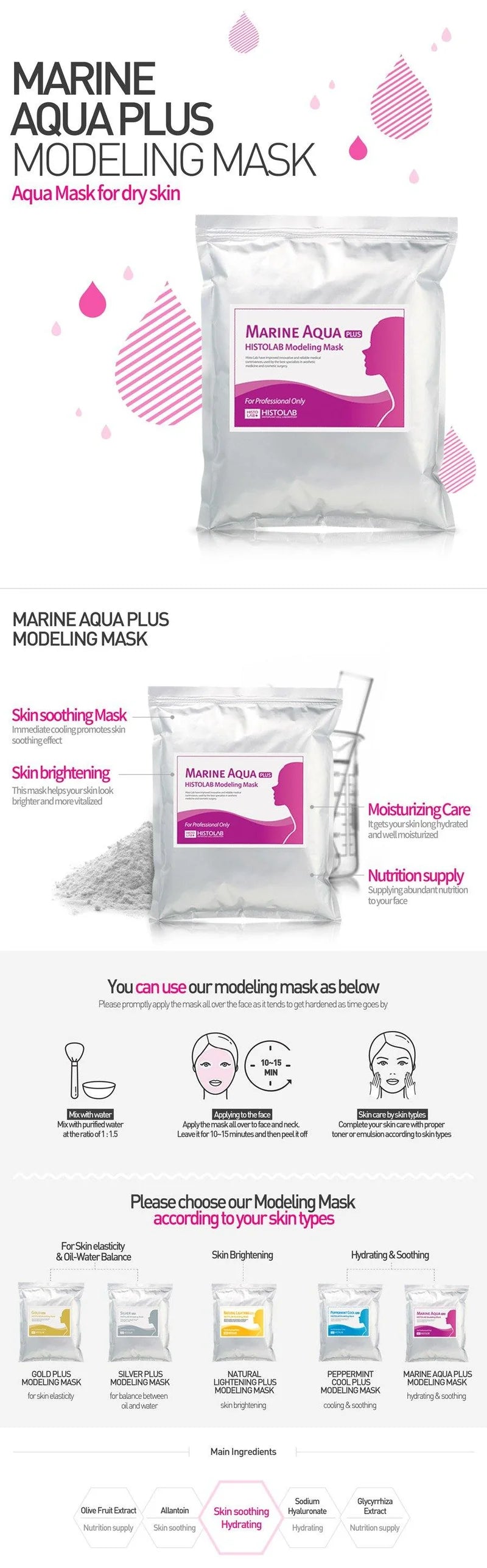 [About HistoLab Modeling Mask] Extraordinary soft and hard modeling masks containing 20% of Algin which is created from brown algae. It is capable of absorbing 200-300 times its own weight in water which helps keep moisturized skin and may also has inflammatory, antiseptic activities. Gentle enough for sensitive, acne-prone skin and safe after even the most aggressive treatments.