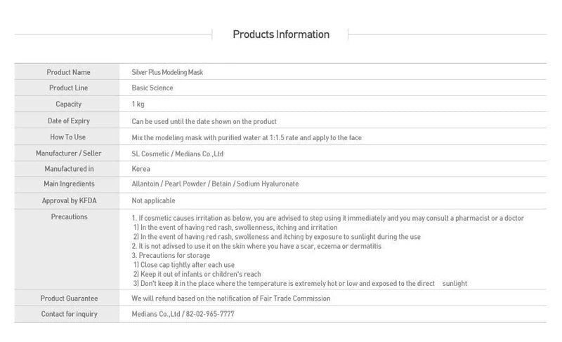 [Ingredients] Diatomaceous Earth, Glucose, Algin, Calcium Sulfate, Tetrasodium Pyrophosphate, Magnesium Oxide, Mica, Titanium Dioxide, Hydrolyzed Collagen, Sodium Hyaluronate, Pearl Extract, Glycyrrhiza Glabra (Licorice) Root Extract, Allantoin
