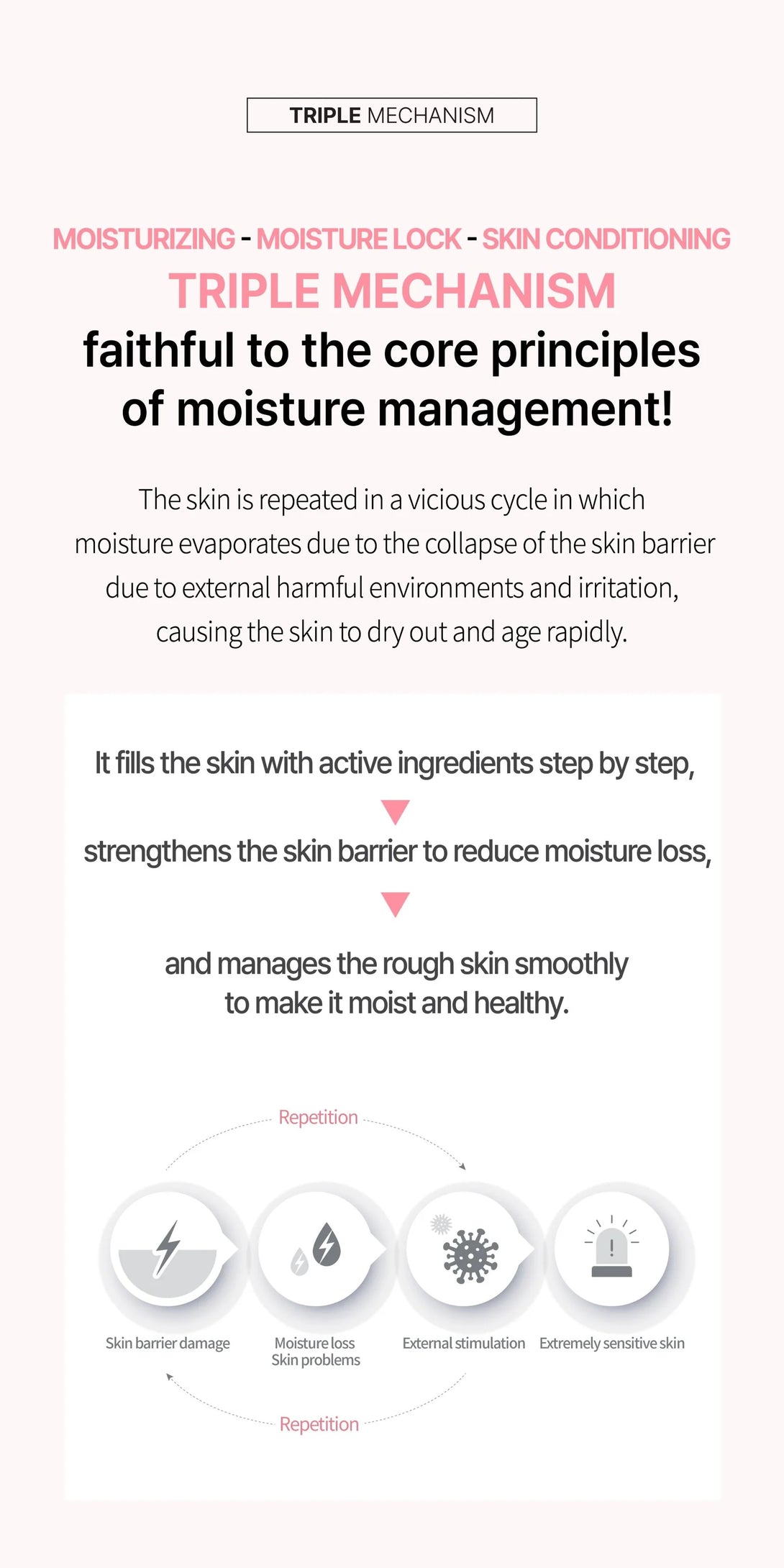 - Triple-action moisturizer fills skin with moisture, strengthens the skin barrier, and smooths the skin.