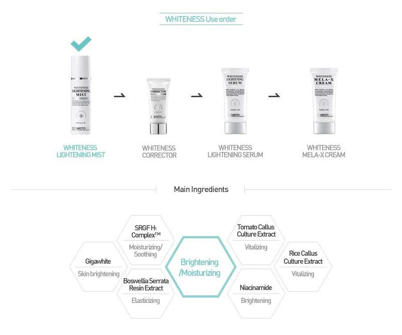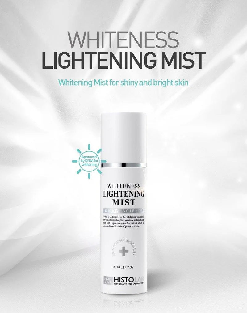 Whiteness Lightening Mist brightens skin tone and hydrates dry skin by providing abundant moisture and nutrition derived from patented peptides and 7 kinds of botanical complex extracts in Alpine (Gigawhite). Suitable for all skin types, especially with pigmentation problems.